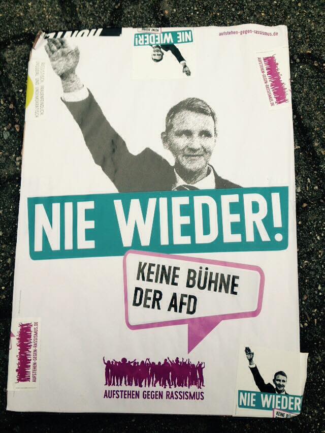 Die Demonstration trägt an diesem 1. Mai Höckes Konterfei stolz auf dem Fronttransparent vorneweg. Dass man den „Tag der Arbeit“ den Gewerkschaften entreißen wolle, hatte bereits Jürgen Pohl klar gemacht. Höckes Rede lässt erahnen, wie er sich das vorstellt. Es geht ihm um eine Umdeutung des 1. Mai, wie sie auch 1933 stattfand, von einem Kampftag zu einem Tag der Anerkennung. Den ArbeiterInnen sollte ihr moralischer und gesellschaftlicher Wert gedankt werden, um sie in die Volksgemeinschaft zu integrieren. Als Teil der Volksgemeinschaft konnte von ihnen Opferbereitschaft und materieller Verzicht verlangt werden.