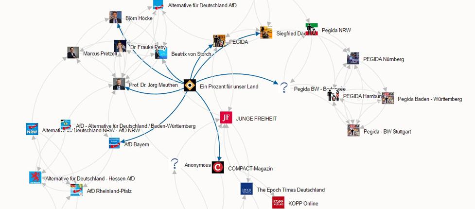 Die Beziehungen von „Ein Prozent für unser Land“ in die rechtspopulistische Szene in Deutschland, visualisiert mit Fanpage Karma.
