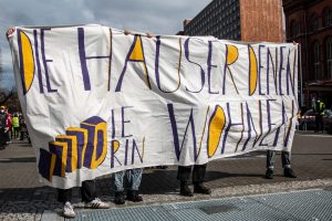 Beitragsbild: Das gemeinsame Transpi der FAUB und der Mieter:innengewerkschaft Berlin während der Housing-Action-Day-Demonstration. Berlin, 27.3.2021 © Philippe Pernot