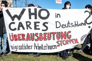 Sie kritisierten die verschärfte Lage der so genannten „ausländischen Haushaltshilfen“ und die Auslagerung der Care-Arbeit an Migrantinnen. Um den Pflegenotstand zu verschleiern, wurden in den letzten Jahren immer mehr überwiegend aus Osteuropa stammende Frauen* angeworben: Seit 2014 hat sich zum Beispiel die Zahl der „Ausländer:innen“ in der Alterspflege fast verdoppelt. Diese Care-Arbeiter:innen leiden dreifach: an Rassismus, Geschlechtsungleichheiten und an den prekären Arbeitsbedingungen der Pflegeberufe. Darüber hinaus sind sie Teil der globalen Betreuungskette, die sich zwischen Peripherie- und Industrieländern spannt und die weltwirtschaftlichen und postkolonialen Ungleichheiten widerspiegelt.