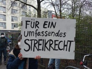 Im letzten Jahr haben sich die Kämpfe bei Gorillas fortgesetzt. Sie drehen sich um mehr Lohn, bessere Arbeitsbedingungen, aber auch um überdachte Pausenräume. Durch diese Kämpfe haben die Beschäftigten die Diskussion um das regressive deutsche Streikrecht auf die Agenda gesetzt. Das wurde in dem Redebeitrag von Duygu Kaya deutlich. Die Akademikerin aus der Türkei beschrieb gut, dass sie als Migrantin auch in Deutschland in prekäre Arbeitsverhältnisse wie bei Gorillas gezwungen ist. Eigentlich wollte Kaya den Beitrag vor Gericht halten, um dort zu begründen, warum sie in den Arbeitskampf trat. Doch das lehnte Richter Kühn mit der Begründung ab, er könne keine Schmähkritik zulassen. Vielleicht störte ihn, dass Kaya auch auf den NS-Hintergrund deutschen Streikrechts hingewiesen hat. 1934 hatte Hans-Carl Nipperday am Gesetz zur Ordnung der Nationalen Arbeit wesentlich mitgearbeitet. In der BRD gehörte er zu den einflussreichen Richtern am Bundesverfassungsgericht, die dafür verantwortlich sind, dass das Streikrecht so repressiv ist. ´